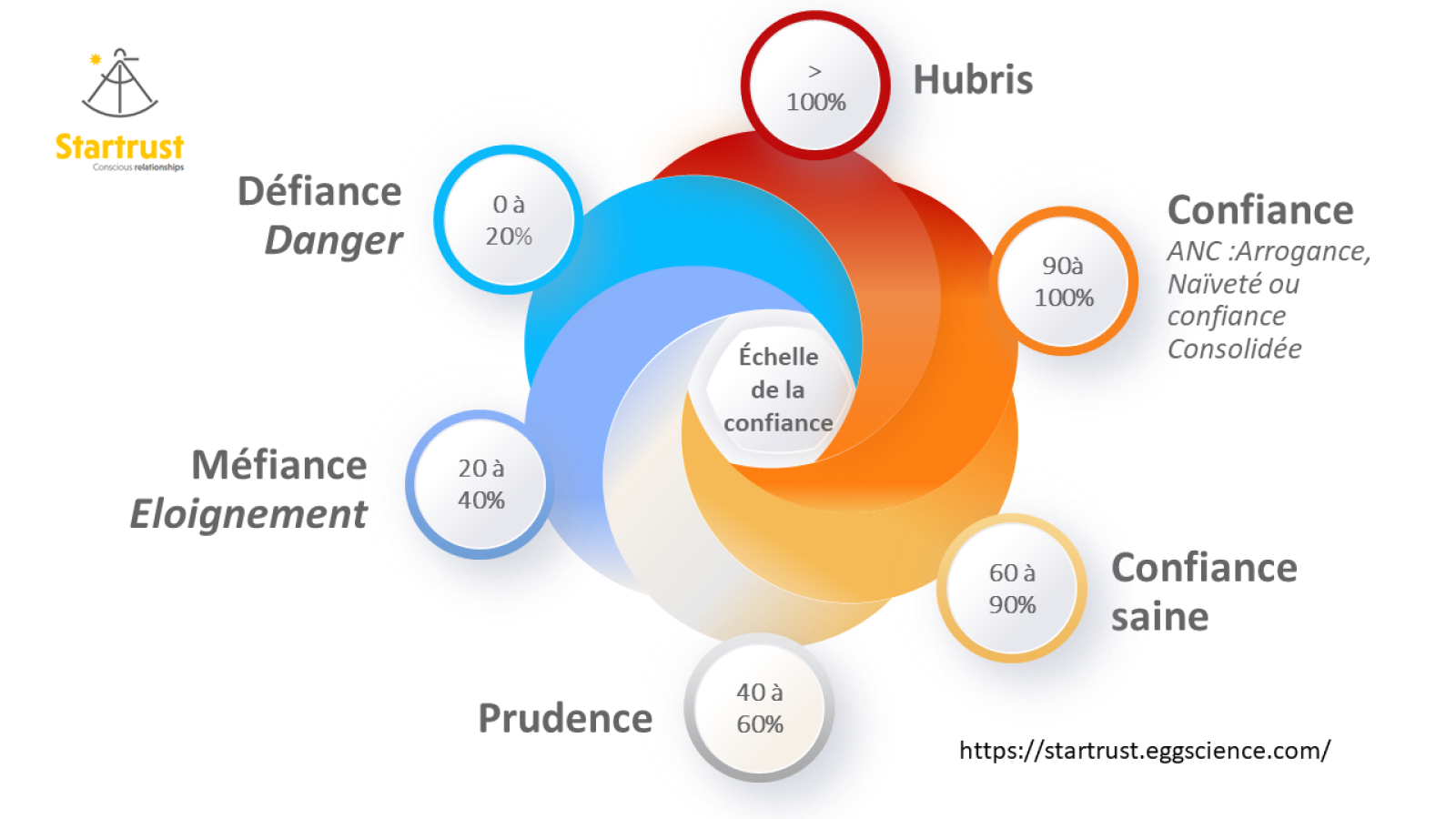 La confiance navigue dans un cycle continuel entre Défiance et Hubris, du point de gel au point d'ébullition, avec comme vrai point de mire la confiance consolidée.